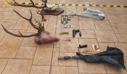 În urma perchezițiilor, au fost ridicate, în vederea cercetărilor, 8 arme de vânătoare, deținute legal, un amortizor de sunet, un dispozitiv de vedere pe timp de noapte, 585 de cartușe de vânătoare, 280 de kilograme de carne de vânat, 8 trofee de cervide, 3 topoare și 4.300 de țigarete, deținute în afara unui antrepozit fiscal, fără a avea timbru de marcaj fiscal.
