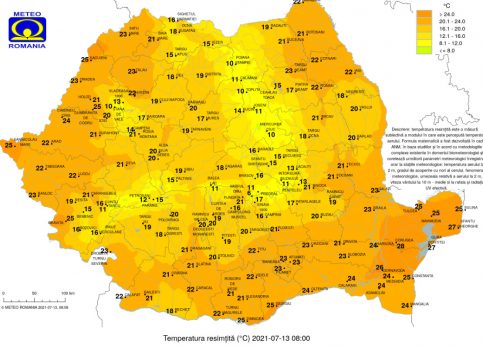 Caniculă și perioade cu averse și astăzi, 13 iulie 2021,vremea va fi călduroasă, chiar caniculară în Crişana, Banat, cea mai mare parte a Olteniei, pe arii restrânse în Muntenia, Transilvania şi Maramureş. Disconfortul termic se va accentua în toată ţara, iar indicele temperatură-umezeală (ITU) va depăşi pragul critic de 80 de unităţi pe arii extinse în regiunile vestice, sudice şi pe alocuri în restul teritoriului.