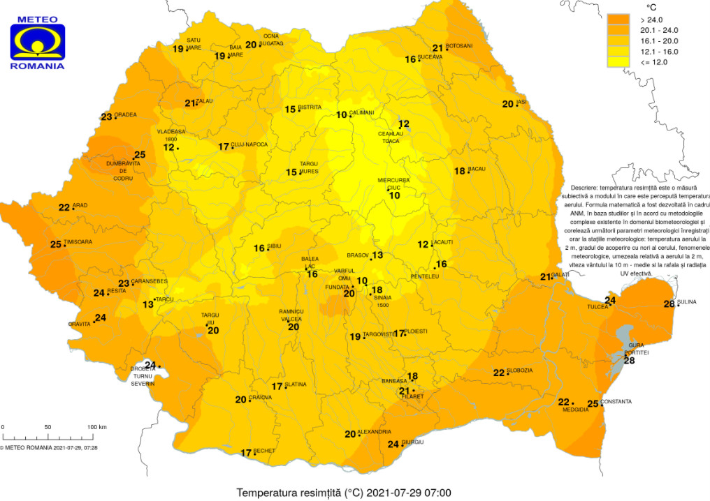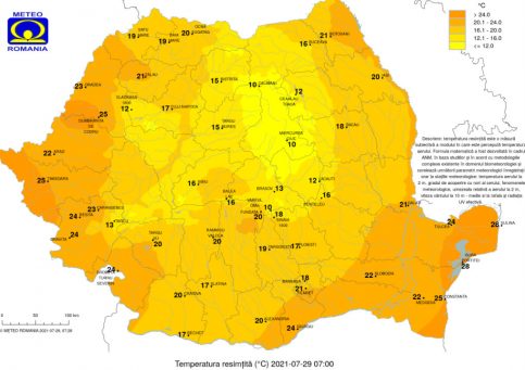 Pe parcursul zilelor de joi, vineri și sâmbătă (29, 30 și 31 iulie) în județele Mehedinți, Dolj, Olt, Teleorman, Giurgiu, Ilfov, Municipiul București și în sudul județului Caraș – Severin disconfortul termic va fi deosebit de accentuat, iar indicele temperatură umezeală (ITU) se va situa peste pragul critic de 80 de unități. Temperaturile maxime se vor situa frecvent între 38 şi 40 de grade.