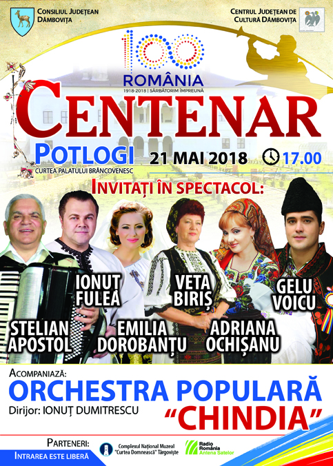 În data de 21 mai 2018, ora 17.00, în incinta Ansamblului Brâncovenesc de la Potlogi, Consiliul Judeţean Dâmboviţa, prin Centrul Judeţean de Cultură Dâmboviţa, va organiza evenimentul Centenar – Potlogi 2018, acţiune ce va celebra cel mai important moment din istoria modernă a României, Marea Unire din anul 1918.