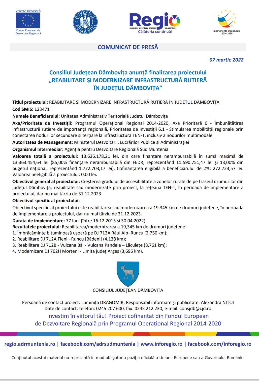 Consiliul Județean Dâmbovița anunță finalizarea proiectului „REABILITARE ȘI MODERNIZARE INFRASTRUCTURĂ RUTIERĂ ÎN JUDEȚUL DÂMBOVIȚA”