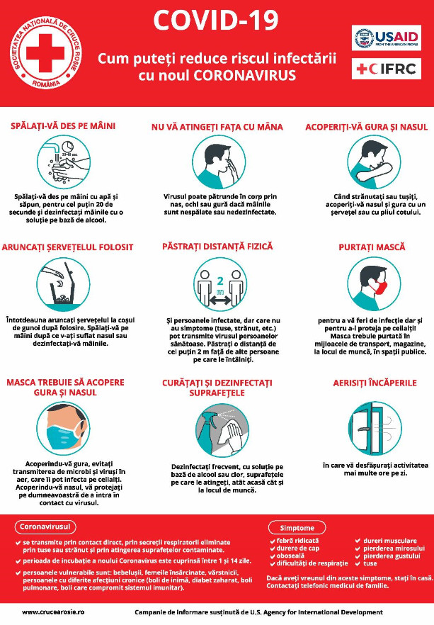 Societatea Națională de Cruce Roșie din România, organizația umanitară cu expertiză în prevenirea și combaterea îmbolnăvirilor și intervenția în situație de dezastre, este în colaborare permanentă cu autoritățile centrale și locale și oferă sprijin logistic, uman și material pentru a consolida răspunsul țării noastre la amenințarea cu noul coronavirus (COVID-19). Mai multe informații despre intervenția Crucii Roșii Române pentru limitarea efectelor negative ale pandemiei COVID19 găsiți aici: www.crucearosie.ro