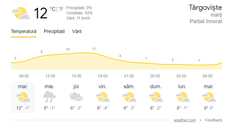 În București, vântul va sufla slab până la moderat, iar temperatura maximă, în creştere faţă de ziua anterioară se va situa în jurul valorii de 12 grade, iar cea minimă va fi de -2…0 grade.
