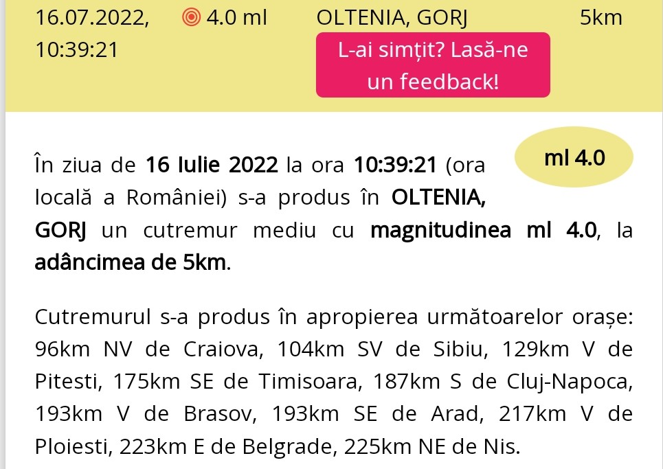 CUTREMUR PUTERNIC ÎN OLTENIA, în ziua de 16 Iulie 2022,  la ora 10:39:21 (ora locală a României) s-a produs în OLTENIA, GORJ un cutremur mediu cu magnitudinea ml 4.0, la adâncimea de 5km.