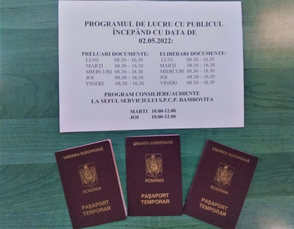 DECIZIE DE ULTIMĂ ORĂ,dispusă de prefectul județului Dâmbovița, Claudia Gilia, schimbarea programului de lucru al Serviciului Public Comunitar de Pașapoarte Dâmbovița, începând cu data de 02.05.2022, astfel: în zilele de luni, marți joi și vineri în intervalul orar 08.30-16.30, iar miercuri în intervalul orar 08.30-18.30.