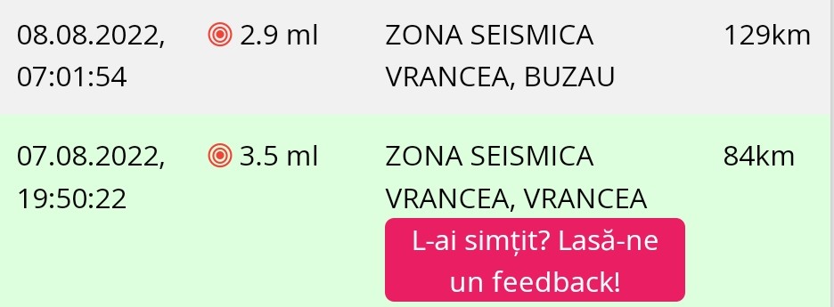 Cel de-al doilea, în ziua de 08 August 2022 la ora 07:01:54 (ora locală a României) s-a produs în ZONA SEISMICA VRANCEA, BUZAU , cu magnitudinea ml 2.9, la adâncimea de 129km.