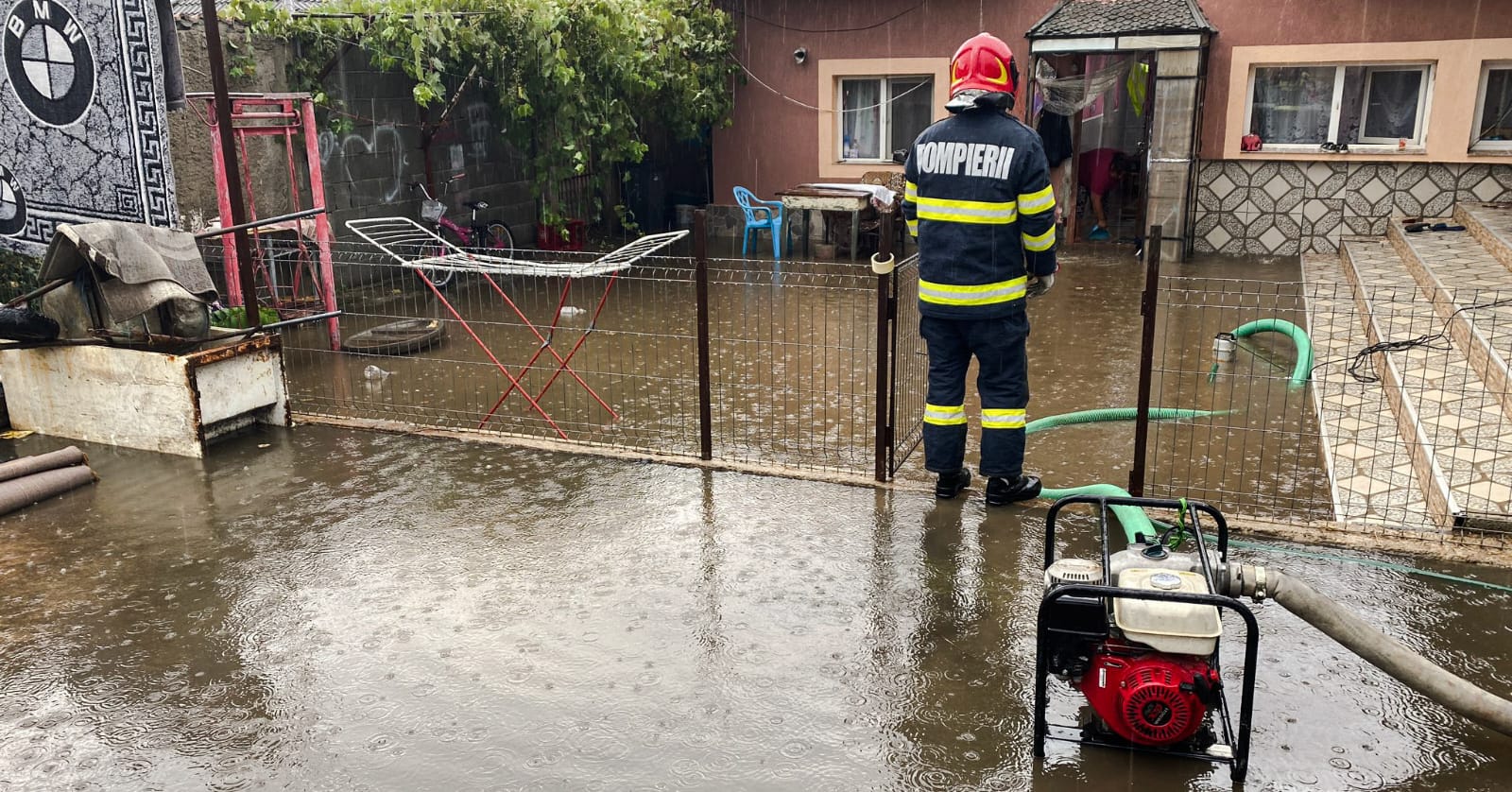 O altă intervenție are loc pentru evacuarea apei dintr-o curte în Târgoviște, str. Oltului, unde acționează Detașamentul Târgoviște cu o autospecială și o motopompă.