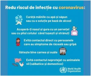 Spălarea și dezinfectarea mâinilor sunt acțiuni decisive pentru a preveni infecția. Mâinile se spală cu apă și săpun cel putin 20 de secunde. Daca nu exista apă și săpun, puteți folosi un dezinfectant pentru mâini pe bază de alcool de 60%.Spălarea mâinilor elimina virusul.