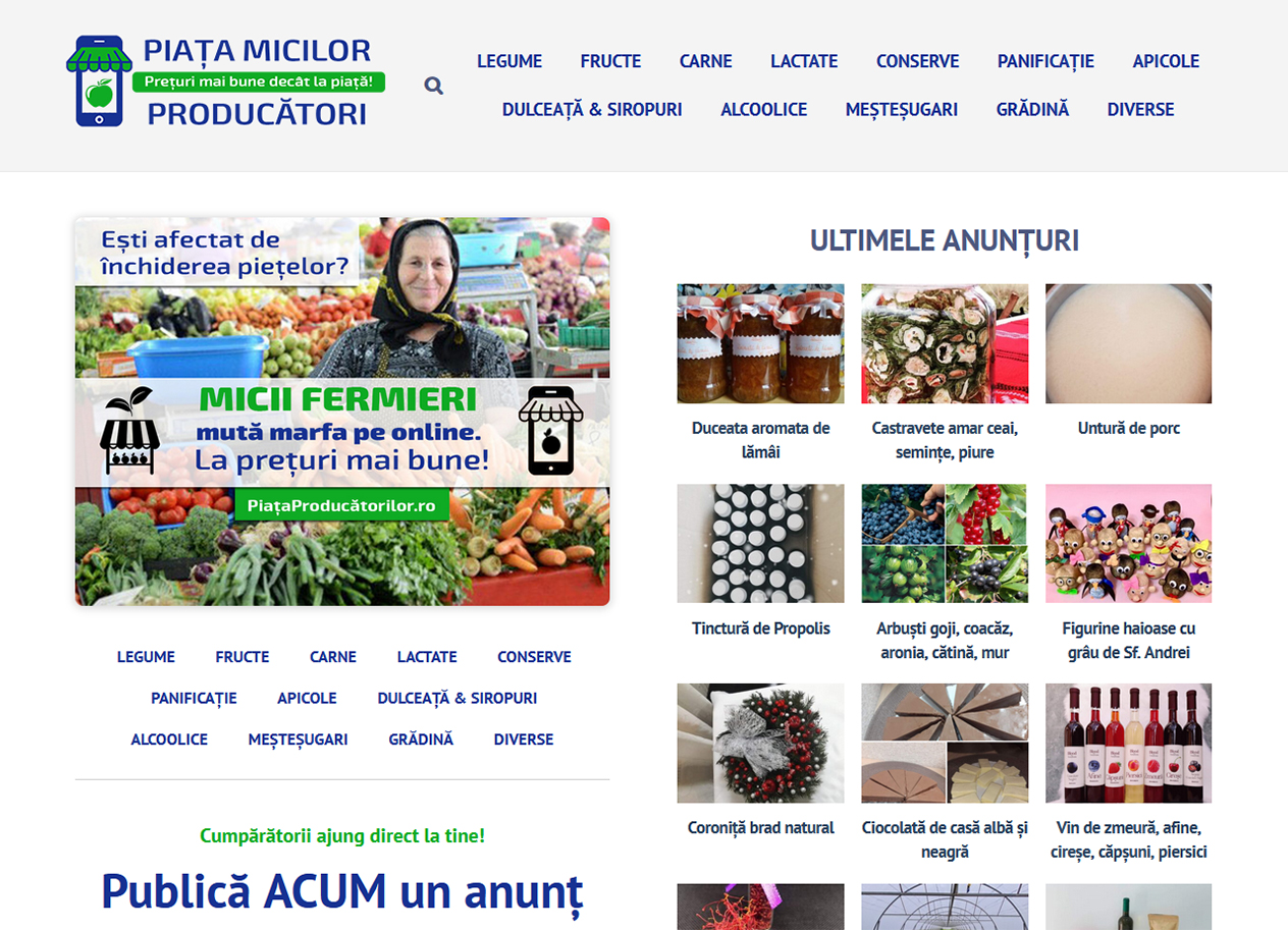 Anunțurile sunt publicate imediat pe prima pagină a portalului și în una din cele 12 categorii de produse (Legume, Fructe, Carne, Lactate etc.), dar și republicate automat pe pagina de Facebook – Piața Micilor Producători, ajungând astfel în fluxul de noutați al abonaților.