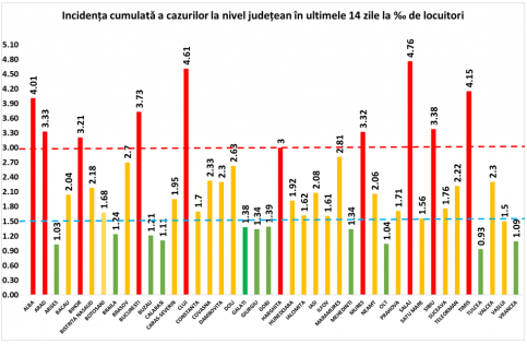 Coeficientul infectărilor cumulate la 14 zile, raportate la 1.000 de locuitori este calculat de către Direcțiile de Sănătate Publică, la nivelul Municipiului București și al județelor. Mai jos aveți graficul realizat în baza raportărilor primite de CNCCI de la Direcțiile de Sănătate Publică: