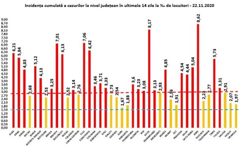 Coeficientul infectărilor cumulate la 14 zile, raportate la 1.000 de locuitori este calculat de către Direcțiile de Sănătate Publică, la nivelul Municipiului București și al județelor. Mai jos aveți graficul realizat în baza raportărilor primite de CNCCI de la Direcțiile de Sănătate Publică: