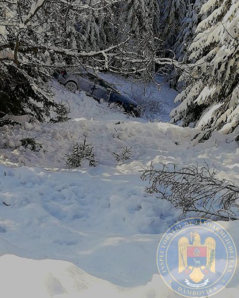 Astăzi, 6 ianuarie a.c., jandarmii montani de la Postul Peștera și salvamontiștii din cadrul Serviciului Județean Salvamont Salvaspeo Dâmbovița au intervenit, în urma unui apel la 112, pe DJ 713 Dichiu – Cuibul Dorului. La aproximativ 700 de metri de cabana Dichiu, pe drumul județean au observant că parapetul metalic era deteriorat, iar într-o râpă, la circa 50 de metri distanță se afla un autovehicul avariat.