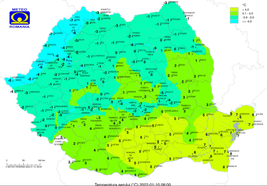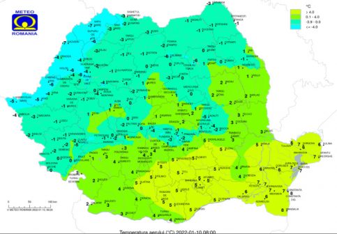 Luni, 10 ianuarie, ploi în toată țara, vântul se intensifica în sud, în est și în zonele montane și începe să aducă un aer mai rece, iar maximele pleacă de la minus 2 grade în Bucovina și ajung pe la 9 grade pe litoral.
