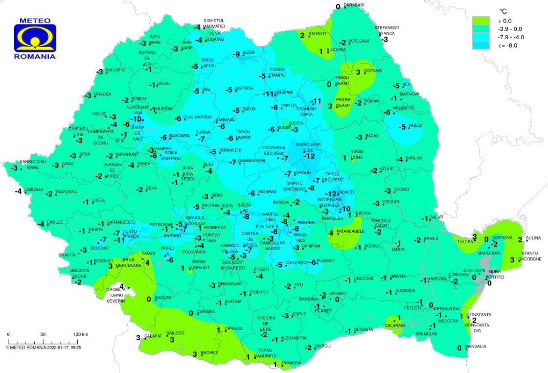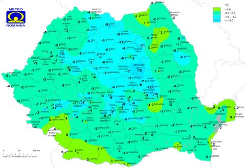 Temperaturile maxime se vor încadra între minus 1 şi 8 grade Celsius, iar cele minime între minus 8 şi 3 grade Celsius. În orele dimineţii, pe spaţii mici, va mai fi ceaţă.