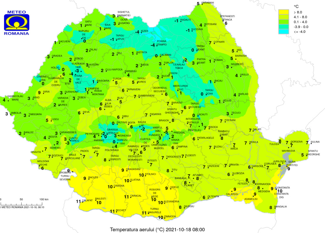 Temperaturile maxime, în creştere uşoară faţă de ziua anterioară, se vor încadra în general între 12 şi 18 grade, iar cele minime se vor situa între 1 şi 10 grade, uşor mai scăzute în depresiuni, unde vor fi condiţii de brumă și ceață .