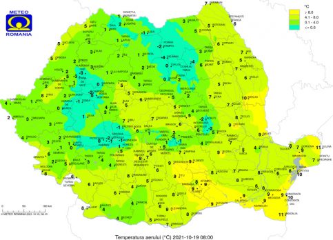 Temperatura maximă se va situa în jurul valorii de 17 grade, iar cea minimă va fi de 6…7 grade, mai scăzută în zona preorăşenească. La începutul intervalului vor fi condiţii de ceaţă.