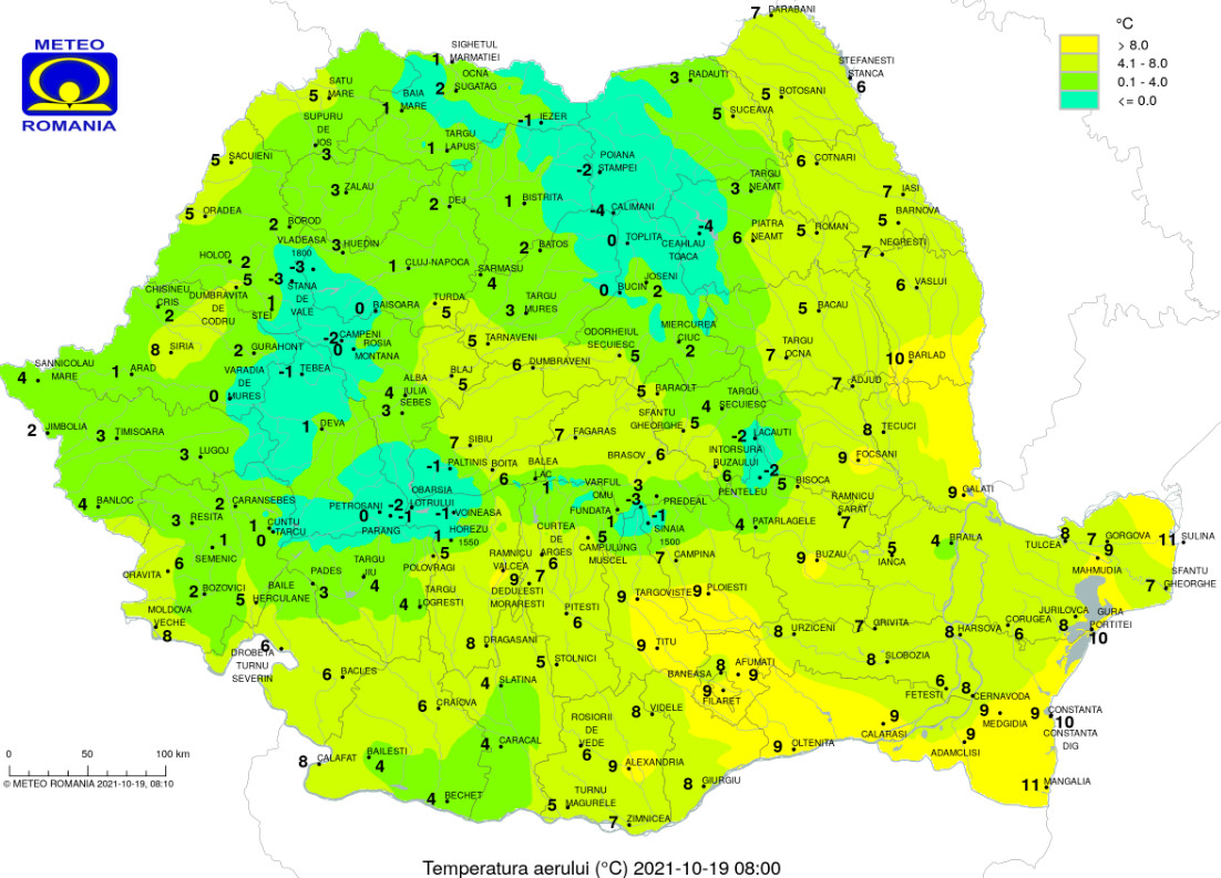 Vântul va sufla slab şi moderat, cu unele intensificări ziua, local în estul ţării şi pe crestele montane. Temperaturile maxime se vor încadra în general între 10 şi 17 grade, iar cele minime între 1 şi 9 grade, uşor mai scăzute în depresiuni.