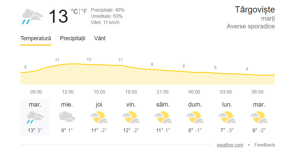 Târgoviște: 14 grade Celsius, Precipitații: 70%, Umiditate: 67%, Vânt: 11 km/h