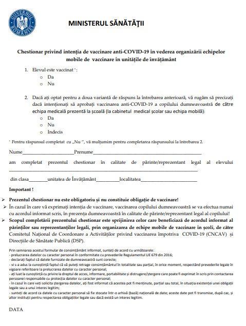 Începând de vineri, 24 septembrie 2021, chestionarul (disponibil aici) va fi diseminat în unitățile de învățământ, prin intermediul inspectoratelor școlare județene. Acesta nu este obligatoriu, nu constituie obligație de vaccinare și va fi pus la dispoziția părinților în vederea completării.