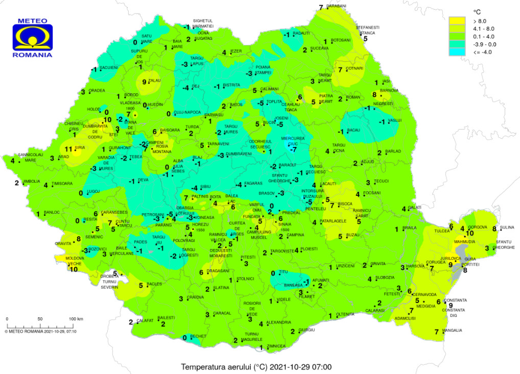 Temperaturile maxime se vor încadra între 11 şi 17 grade, iar cele minime între -4 grade în estul Transilvaniei şi 11 grade pe litoral. Dimineaţa şi noaptea, pe alocuri, în zonele joase de relief, va fi ceaţă.