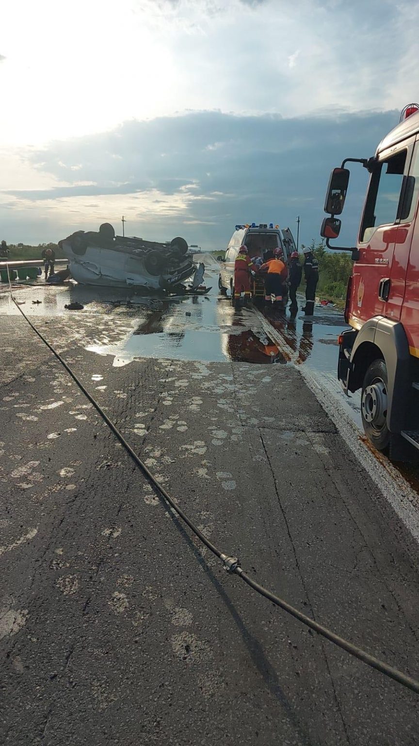 Pompierii asigură măsurile de prevenire a incendiilor la locul accidentului având în vedere scurgerile de lichide combustibile de pe carosabil.