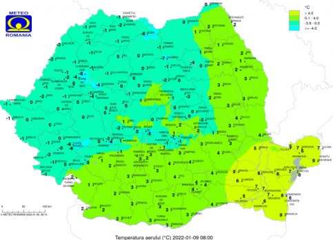Vântul va sufla slab şi moderat, cu unele intensificări spre sfârşitul intervalului în sudul şi sud-estul teritoriului. Temperaturile maxime vor fi cuprinse între 1 şi 11 grade, cu cele mai ridicate valori în Dobrogea, iar cele minime, în general, între -4 şi 4 grade. Izolat se va forma ceaţă. Presiunea atmosferică va scădea în prima parte a intervalului.