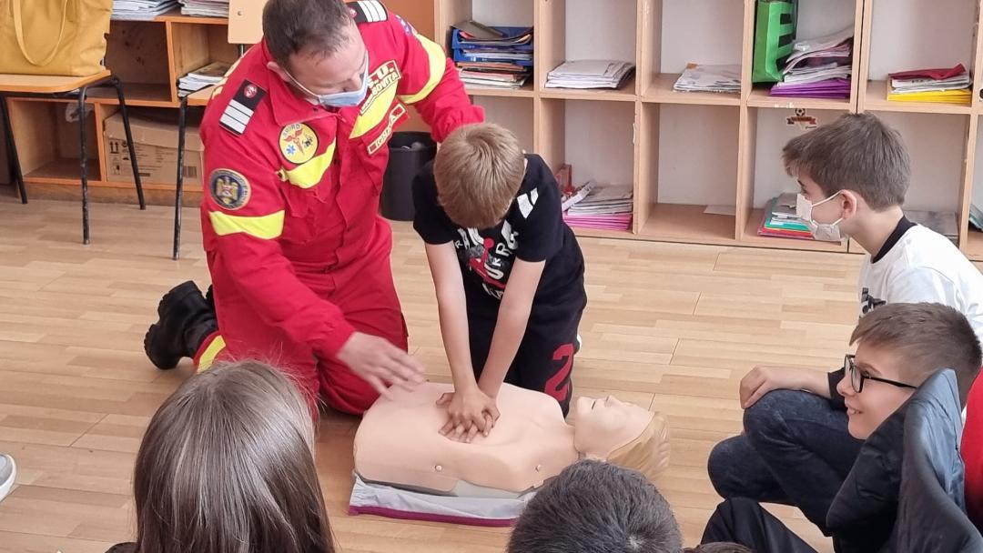 un instructor pentru formarea paramedicală de la Centrul de Formare și Pregătire în Descarcerare și Asistență Medicală de Urgență din cadrul Inspectoratului pentru Situații de Urgență ”Basarab I” al județului Dâmbovița a fost în mijlocul copiilor din clasa a IV-a de la Școala ”Paul Bănică” din Târgoviște, unde aceștia au primit informații pe înțelesul lor și au exersat unele operațiuni pentru acordarea primului ajutor