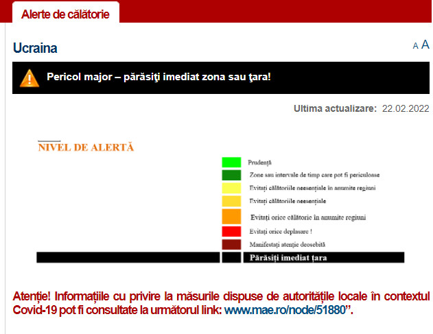 Părăsiţi imediat ţara, MAE a ridicat nivelul de alertă pentru Ucraina, și le solicită cu insistență cetățenilor români să nu se deplaseze în această țară, iar celor care se află temporar în Ucraina să părăsească teritoriul acestui stat imediat.