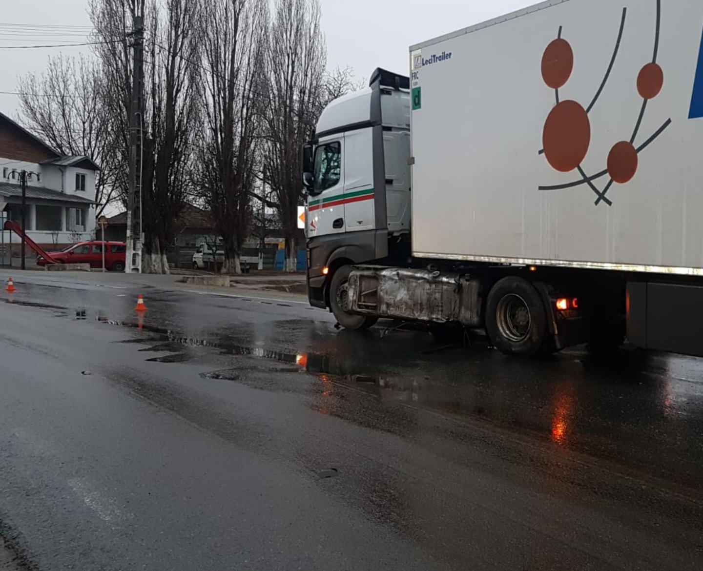 În judeţul Dâmboviţa, pe DN 72 Târgovişte-Ploieşti, pe raza localităţii Dărmăneşti , un autoturism al cărui conducător auto în vârstă de 28 de ani nu a adaptat viteza la condiţiile unui carosabil umed, într-o curbă, a intrat în coliziune cu unTIR, condus de un şofer în vârstă de 44 de ani. Nu au rezultat victime. Poliţiştii fac cercetări la faţa locului.