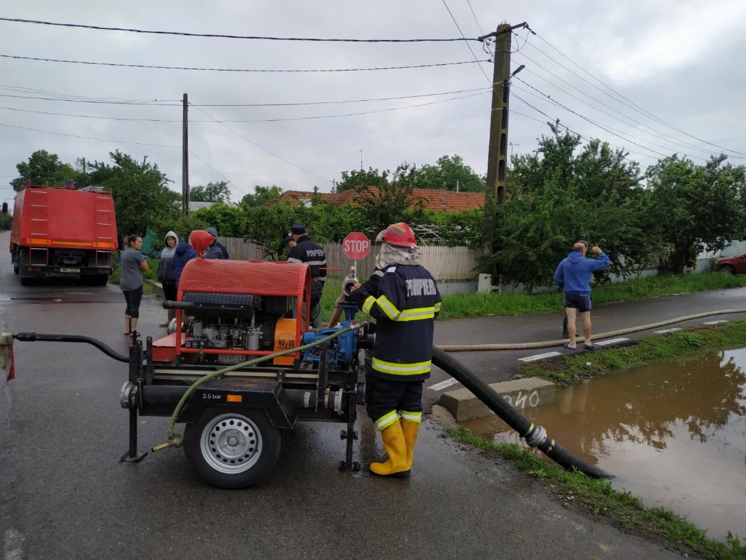 Pompierii dâmbovițeni continuă acțiunile de degajare a apei provenită din precipitațiile căzute în cantitate mare în după-amiaza zilei de 17 iunie 2020.