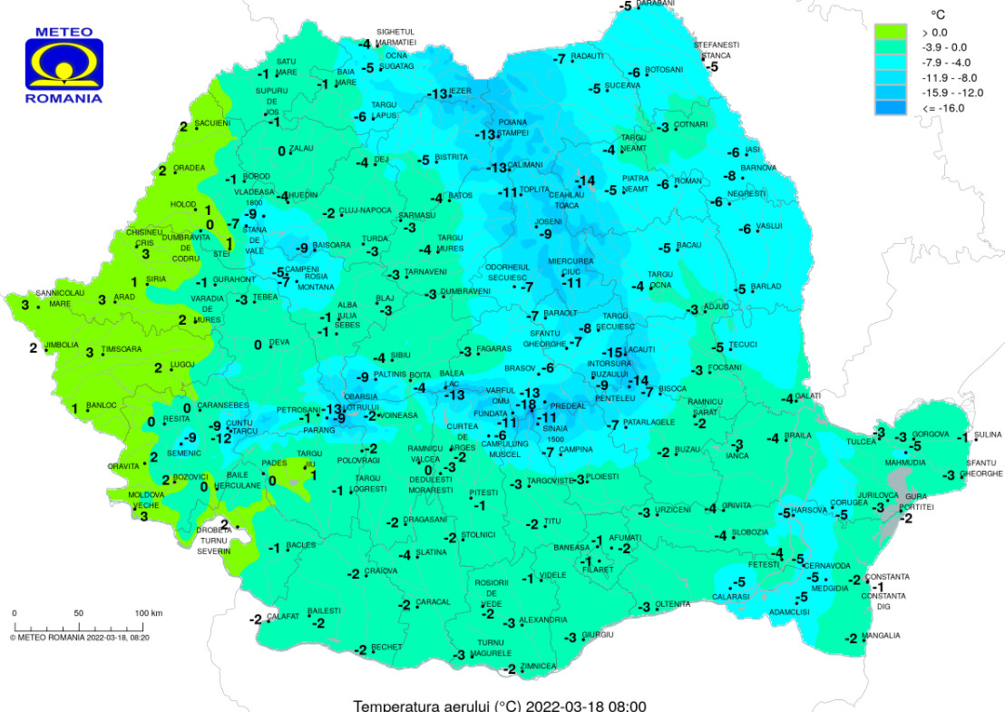 Temperaturile maxime înregistrate astăzi la nivelul întregii țări se vor încadra între -2 și 9 grade, pe când minimele se vor încadra între -10 și -3 grade.
