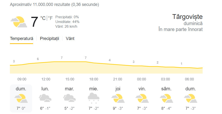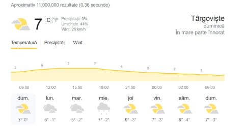 Temperaturile maxime se vor încadra între 3 grade Celsius și 11 grade Celsius, în timp ce valorile minime vor fi cuprinse între -6 grade Celsius și 3 grade Celsius. Dimineața este posibil să existe condiții de ceață.
