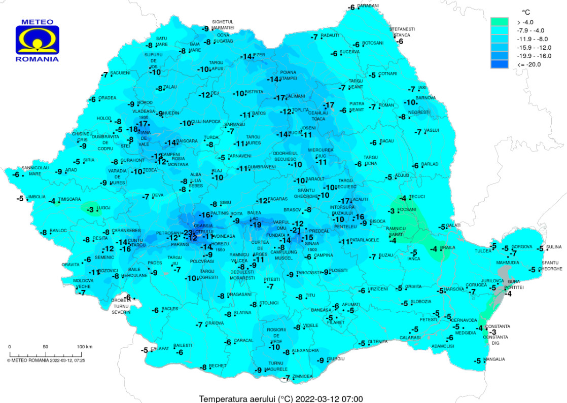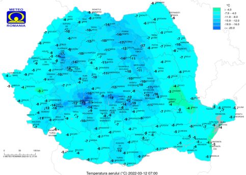 Prognoza meteo pentru ziua de sâmbătă, 12 martie 2022, vremea va fi deosebit de rece,temperaturile vor fi foarte scăzute dimineața și noaptea în centru, local în nord, dar și în zonele montane.
