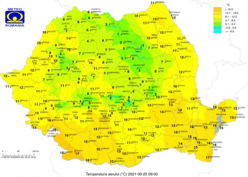 Temperaturile minime vor fi cuprinse între 3 și 15 grade Celsius, în timp ce maxime se vor încadra între 17-18 grade Celsius în nordul extrem și 28 de grade Celsius în sud-vestul României. Pe arii restrânse, dimineața și noaptea, se vor semnala condiții de ceață.