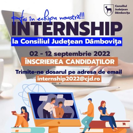 S-a dat startul înscrierilor la Programul Internship 2022 la CJ Dâmbovița, pentru al doilea an consecutiv, tinerii care vor să se implice în viața județului, dar, în același timp, să dobândescă experienţă în cea mai importantă administrație publică a județului, Consiliul Județean Dâmbovița, pot transmite, de astăzi, 2 septembrie până pe 12 septembrie, documentele necesare participării la program: