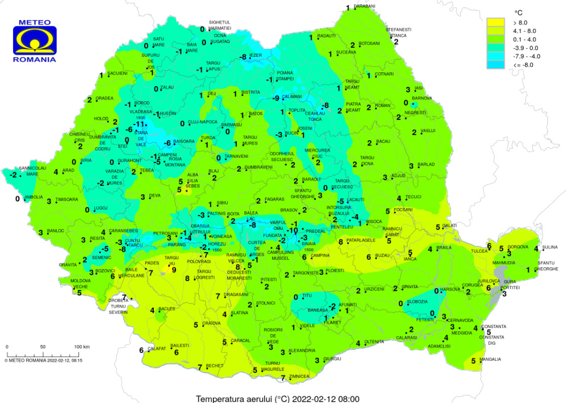 Temperaturile maxime se vor înregistra între 1 și 12 grade Celsius, în timp ce temperaturile minime vor fi curprinse între -12 și -10 grade Celsius în depresiunile din estul Transilvaniei, iar 3 grade Celsius în vestul Olteniei.