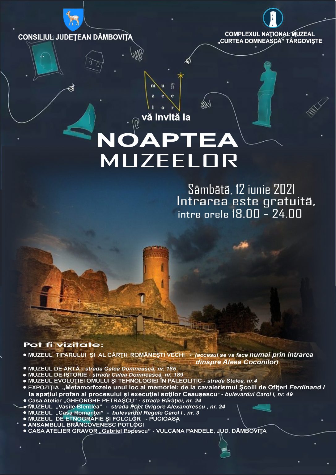 Sâmbătă, 12 iunie 2021, „Noaptea Muzeelor” și în judeţul Dâmboviţa, astfel Consiliul Județean Dâmbovița, prin Complexul Național Muzeal „Curtea Domnească” Târgoviște, organizează cea de-a a XVII – a ediţie a evenimentului cultural, invitând publicul să descopere expozițiile muzeelor într-un mod inedit, făcând o plimbare nocturnă prin istoria și arta judeţului Dâmboviţa.
