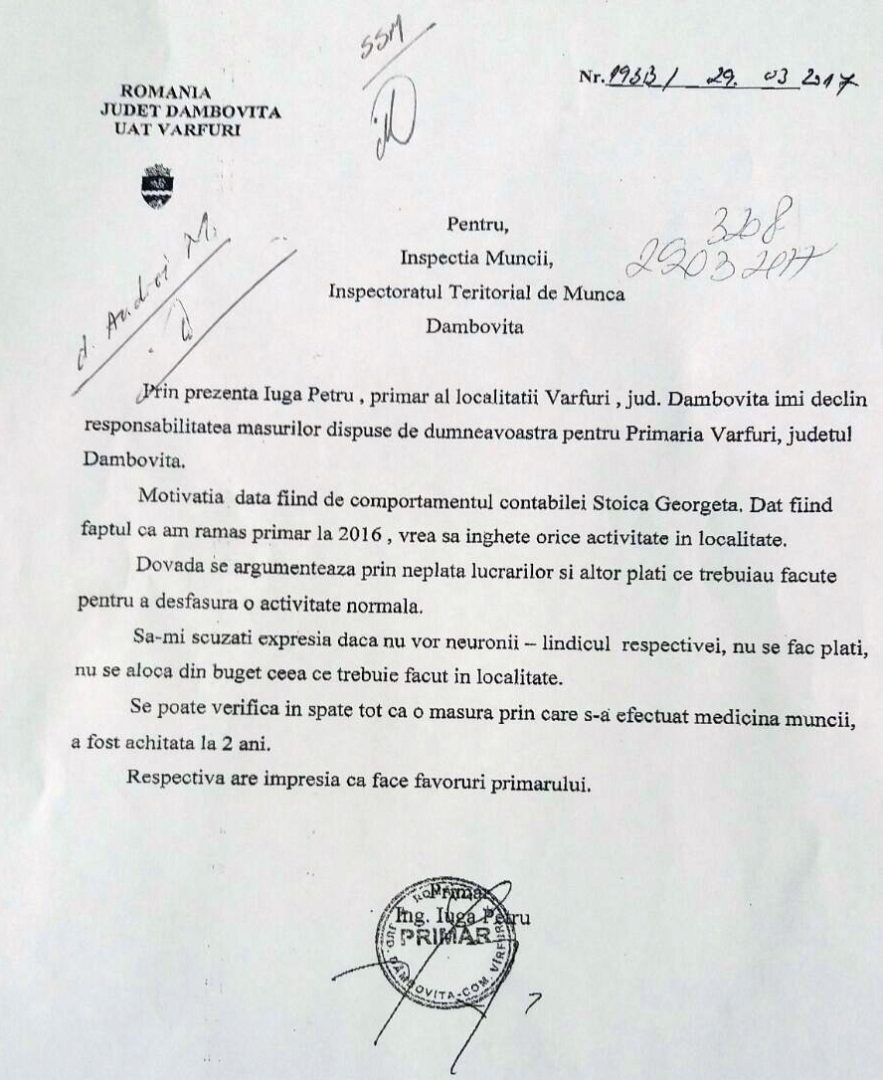 De curând, conducerea Inspectoratului Teritorial de Muncă Dâmbovița a rămas fără cuvinte când a primit o adresă de la primarul comunei Vârfuri, Petre Iuga în care folosește expresii pe care noi nu le putem reproduce, la adresa contabiliei Primăriei Vârfuri cu care edilul este în război .
