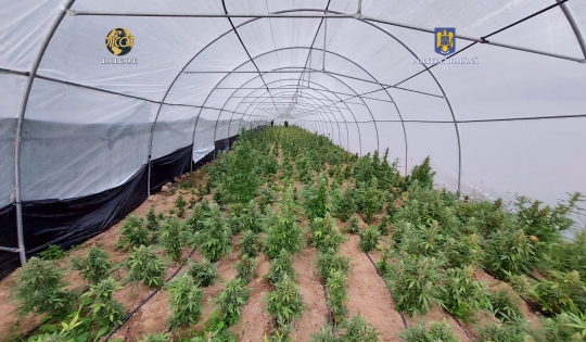 În urma percheziției efectuate la locația respectivă, au fost descoperite două solarii, de mari dimensiuni, amenajate în vederea cultivării plantelor de cannabis, prevăzute cu sisteme de irigare și ventilație, în care au fost găsite 2.628 de plante de cannabis, în diferite stadii de dezvoltare.