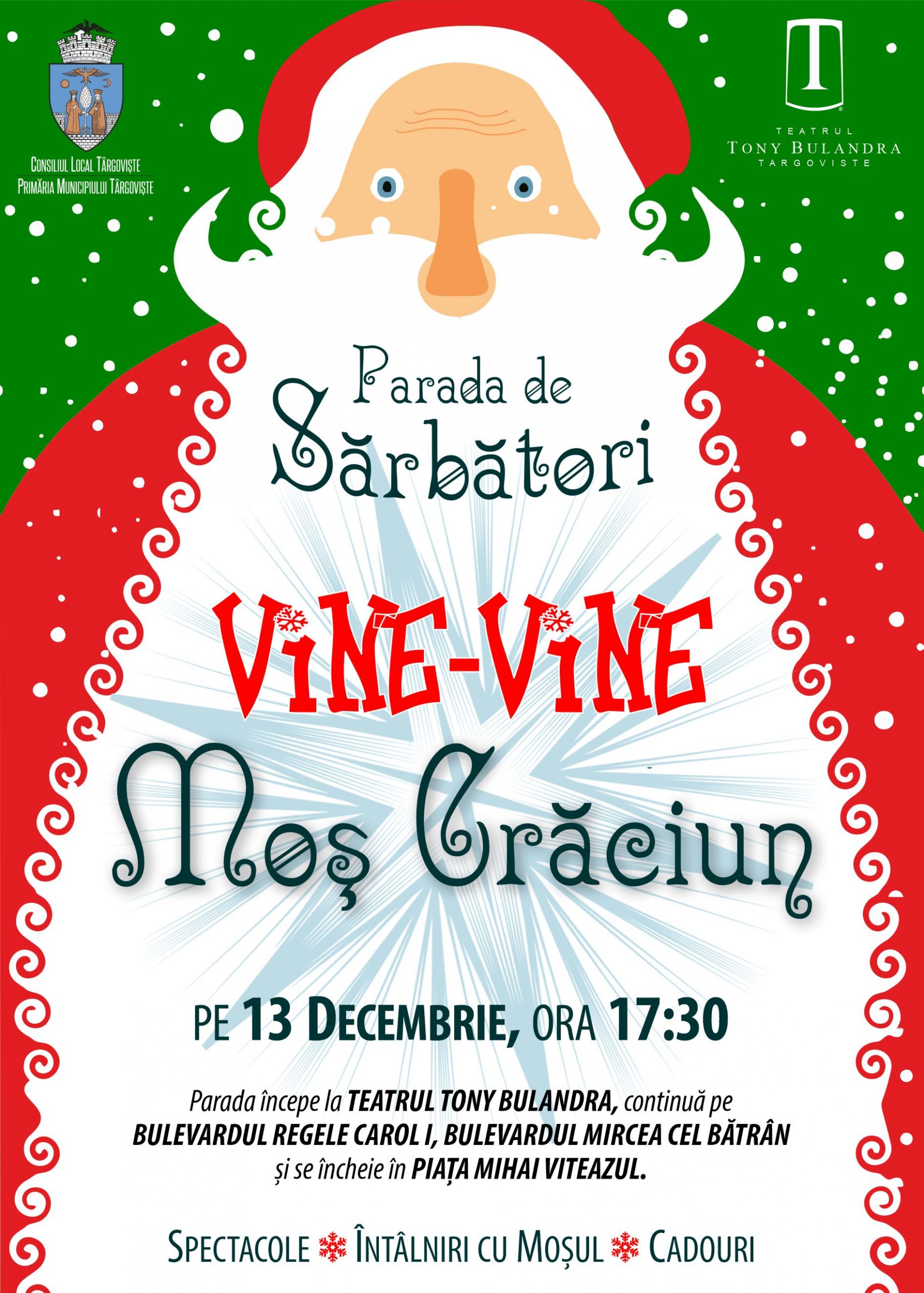 Alaiul lui va străbate Târgoviștea de la Teatrul „Tony Bulandra” până în Piața Mihai Viteazu. Ora plecării – 17:30. Ora sosirii – 18:00. Moșul este foarte bine organizat, altfel nu ar putea să împartă un număr impresionant de cadouri în doar trei zile: 13 decembrie (începând cu ora 18:00), 15 și 16 decembrie (începând cu ora 17:00). Înarmați-vă cu poezioare, dar și cu răbdare… Moș Crăciun are un dar pentru fiecare!