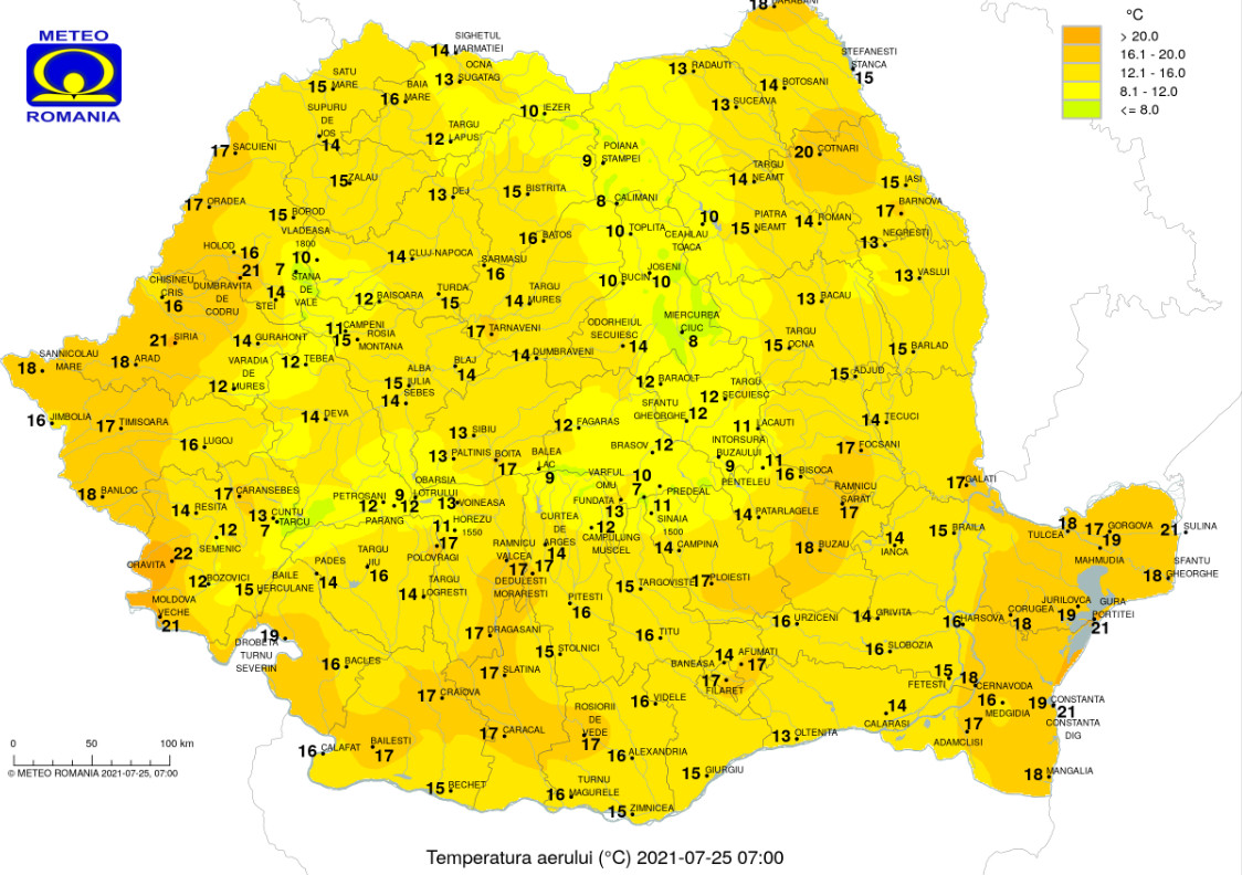 Temperaturile pe 25 iuli,e se vor situa ușor sub pragul caniculei, duminică vremea se încălzește în special în Vestul și în Sudul teritoriului, maximele se vor situa între 27 și 34 de grade.