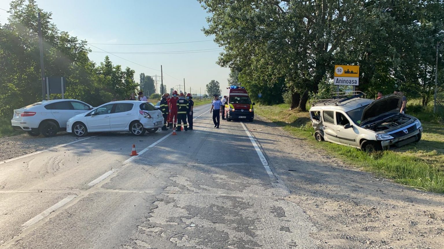 Trei autoturisme implicate într-un accident în comuna Aninoasa, la fața locului intervin pompierii pentru asigurare zonă.