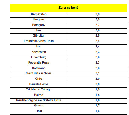 –în zona galbenă din zona verde, în urma creșterii incidenței au intrat : Grecia, Luxemburg, Gibraltar, Kazahstan, Insulele Feroe și Libia;