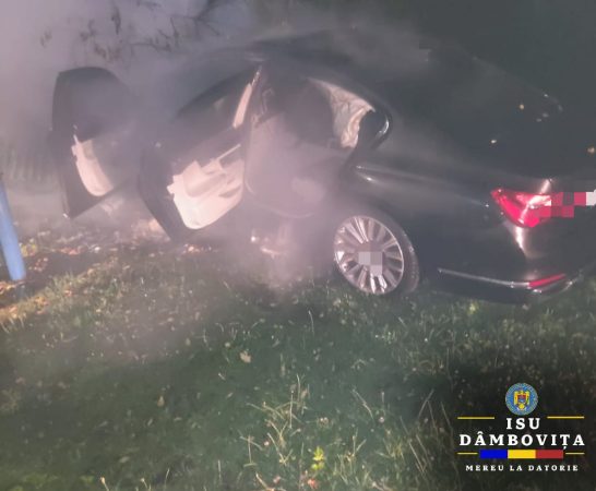 Un bolid a luat foc după ce s-a izbit de un stâlp de electricitat, două persoane au avut nevoie de îngrijiri medicale, noaptea trecută, în jurul orei 04:05, pompierii au fost solicitați să intervină în cazul unui incendiu produs la un autoturism în localitatea Mănești, pe DJ 702B.