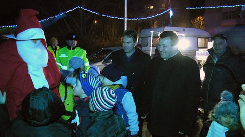 Vineri seară, 23 decembrie, seara colindului, una dintre cele mai răspândite datini la români, din Ajunul Naşterii Domnului, denumit şi Ajunul Crăciunului, Moș Crăciun a sosit în orașul Fieni cu o caleașcă trasă de doi cai. Cei mici nu mai pridideau să stea de vorbă cu Moș Crăciun și să-i cânte colinde.