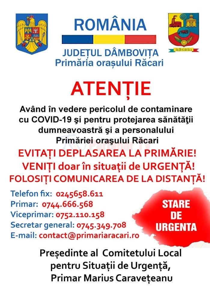 Şi edilul oraşului Răcari, Marius Caraveţeanu apelează la responsabilitatea răcărenilor, dâmboviţenilor şi nu în ultimul rând la responsabilitatea tututror românilor în respectarea indicațiilor specialiștilor, pentru prevenirea răspândirii virusului. Primarul Marius Caraveeanu a mulţumit medicilor pentru munca depusă în lupta cu coronavirusul şi a îndemnat că cetăţenii să aibă grijă de sănătatea apropiaţilor.Dacă ne vom izola şi vom respecta regulile de igienă personală, COVID-19 va putea fi oprit