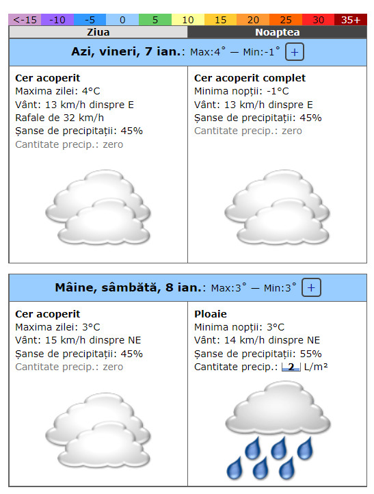 În celelalte zone ale României, cerul va fi acoperit pe tot parcursul zilei de nori, iar pe arii restrânse se vor semnala precipitații slabe predominant sub formă de ploaie. Noaptea aduce cu ea înnorări accentuate și ploi în Dobrogea, precipitații mixte în Muntenia, dar și ninsori în Banat, Crișana și izolat în celelalte regiuni.