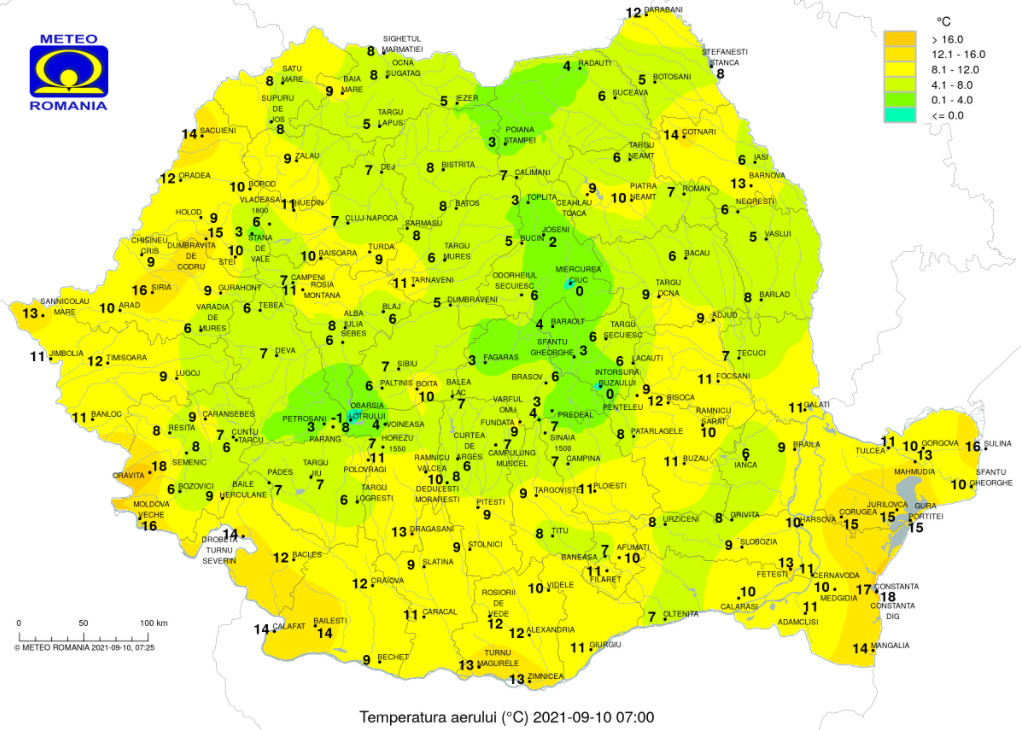 Minimele se vor situa între 6 şi 16 grade, mai scăzute în estul Transilvaniei, până spre 1 grad, dar şi uşor mai ridicate pe litoral, pânâ spre 17…18 grade.