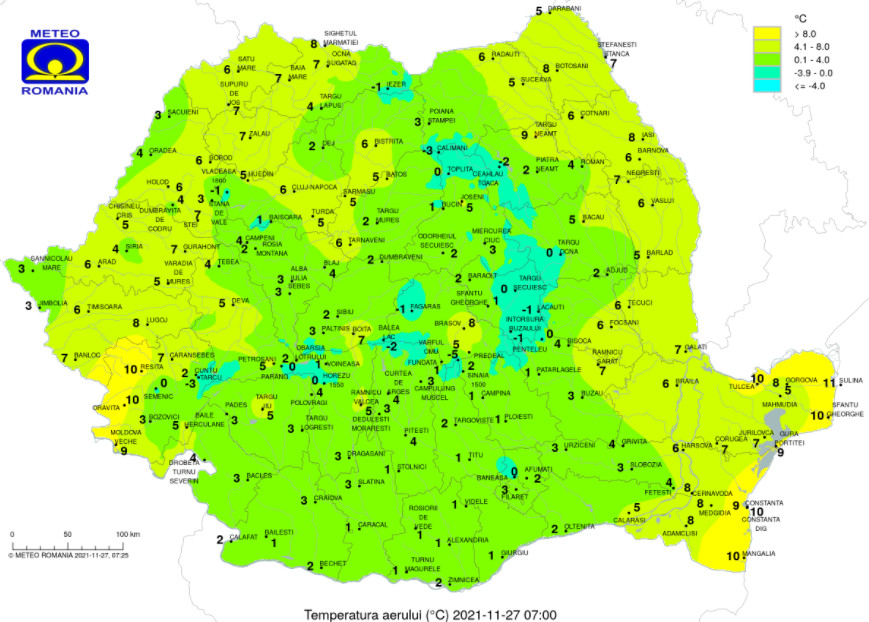 Temperaturile maxime se vor încadra între 7 şi 16 grade, iar cele minime vor fi cuprinse între 0 şi 10 grade, mai scăzute în depresiunile intramontane. Pe alocuri se va semnala ceaţă.