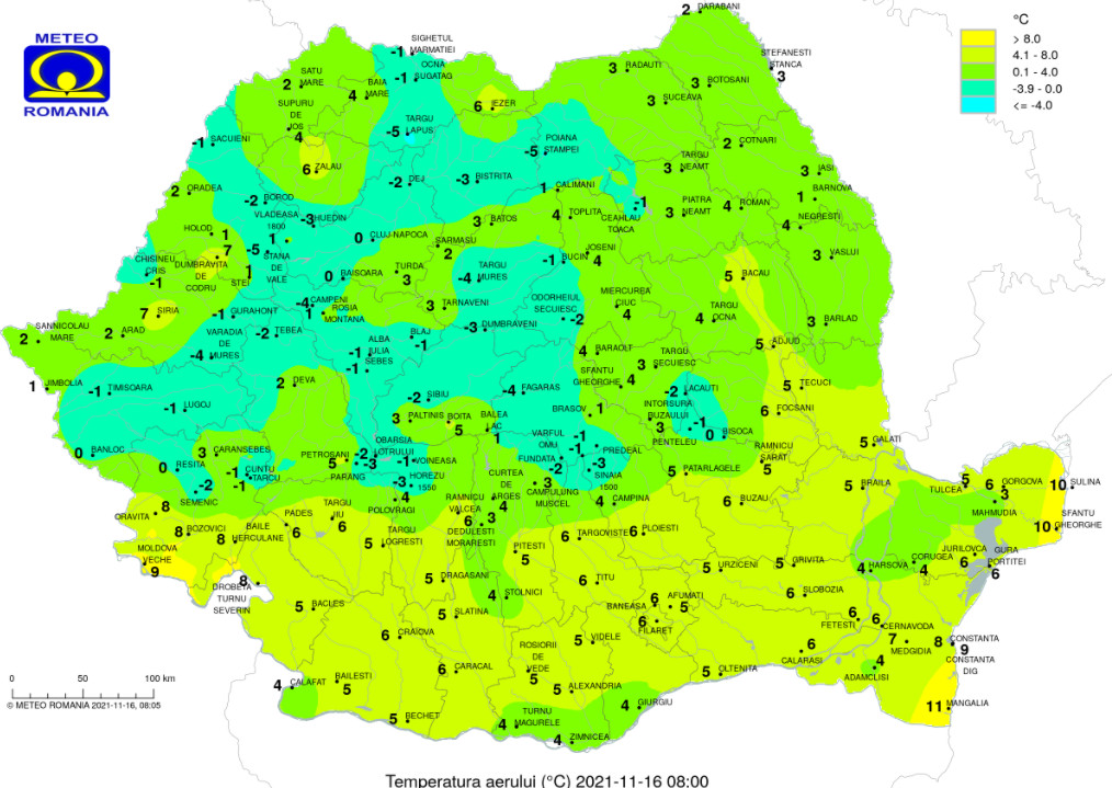 Minimele vor scădea de la 4…5 grade, în data de 15 noiembrie spre valori medii în jurul a 0 grade, în data de 18 noiembrie.